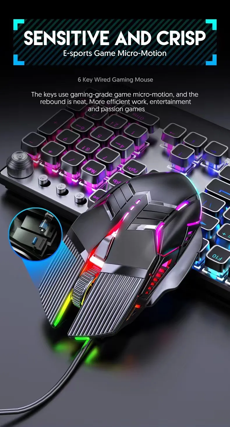 The Wired 6D Colorful Dazzling E-sports Games Office Mute Luminous Mouse offers a dynamic and versatile experience for both gamers and professionals. Featuring a dazzling multi-color LED design, this mouse brings an eye-catching glow to your workspace or gaming setup, making every click an engaging experience. With its 6D (six-dimensional) design, it provides precision control and an array of buttons for customizable functions, giving you an edge in intense gaming sessions or enhancing productivity in the office. The wired connection ensures low latency and quick responsiveness, so you’re always in control, no matter the task.
