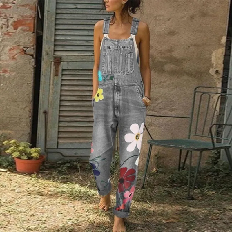 women's denim overalls, high-waisted jumpsuit, loose fit overalls, straight leg denim, unique print overalls, casual denim jumpsuit, fashionable denim overalls, trendy denim overalls, versatile overalls, classic denim jumpsuit, comfortable jumpsuit for women.