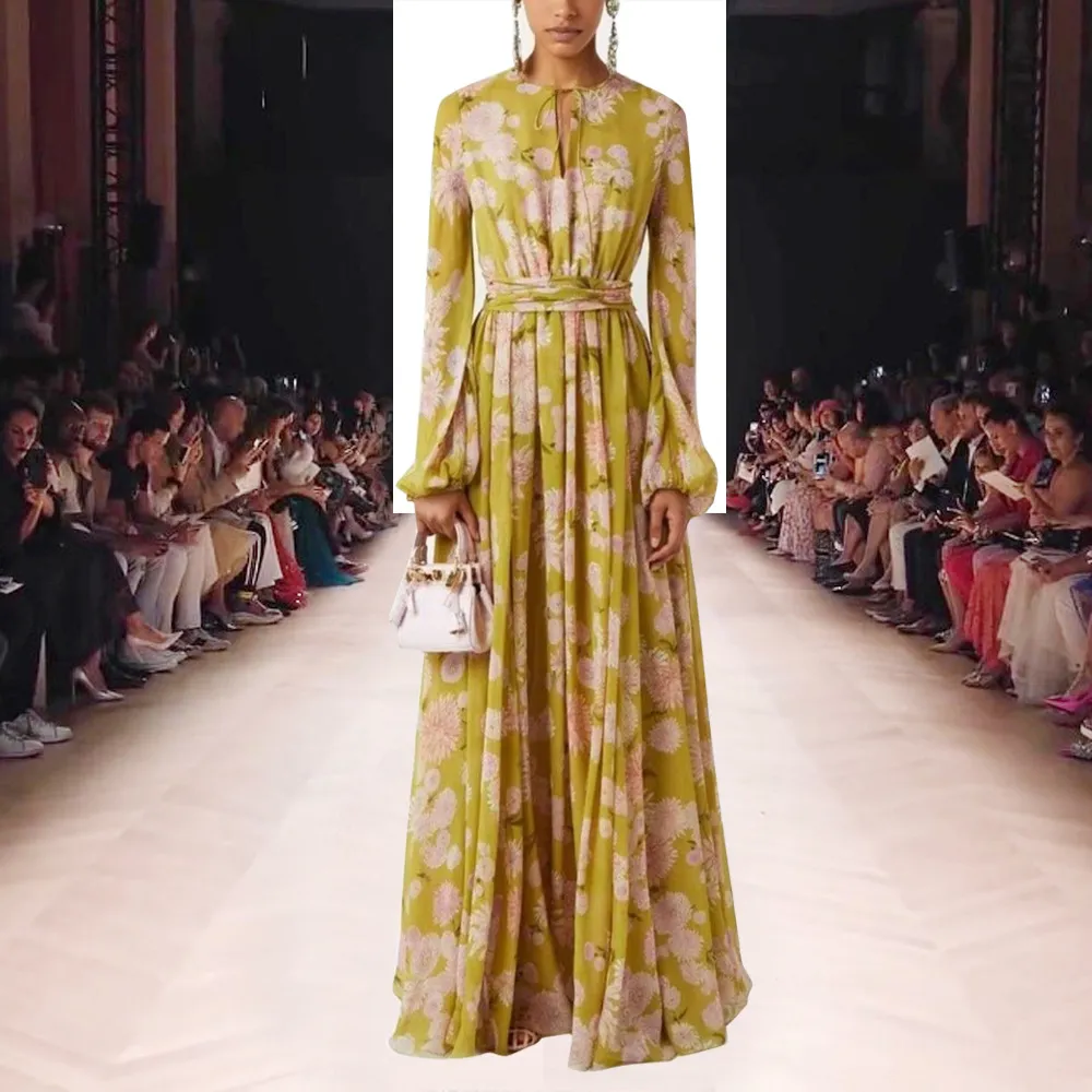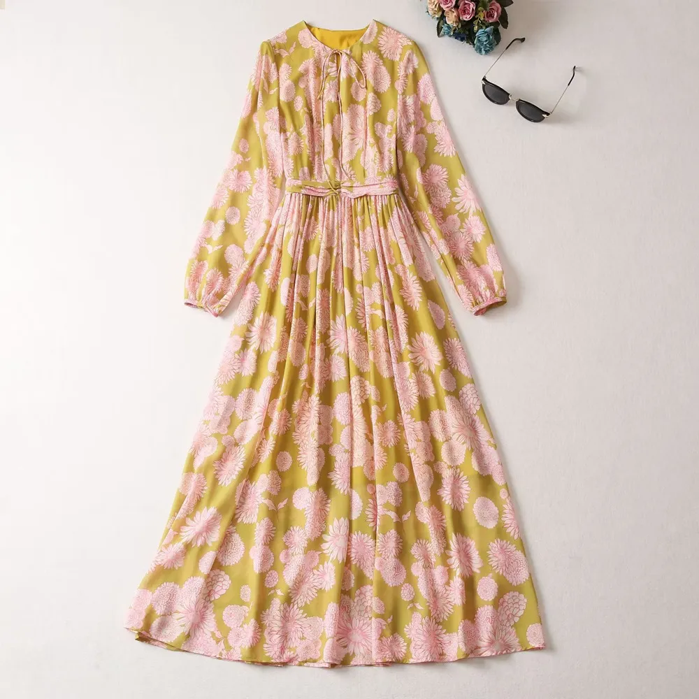 Women's Round Neck Tied Lantern Long Sleeve Dress
