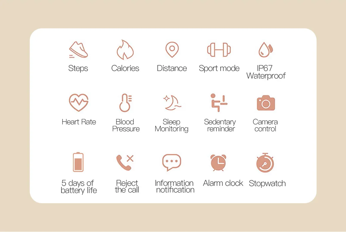 Designed for women with an active lifestyle, the Women’s Smart Watch includes a variety of features to track your fitness and well-being. Whether you’re running, walking, cycling, or working out at the gym, this multi-function fitness tracker provides detailed insights into your activity levels, including calories burned, distance covered, heart rate, and step count. The watch helps you set goals and track your progress, keeping you motivated to stay active and healthy.