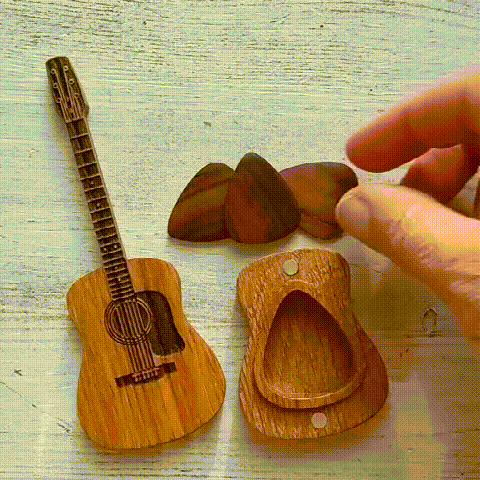 The wooden acoustic guitar box can holds three wooden guitar picks.