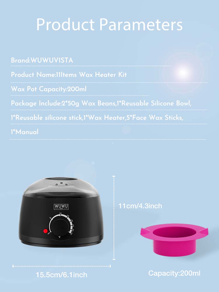 What's Inside: 1. Portable 200cc Wax Warmer for convenient heating 2. Smooth & Silky Wax Beans (50g*2) for effective hair removal 3. Food Grade Non-Stick Silicone Bowl for easy after wax cleaning 4. Non-Stick Wax Silicone Spatula for body application 5. 5 Face Wax Sticks for detailed facial grooming 6. User Guide for hassle-free setup and usage tips.