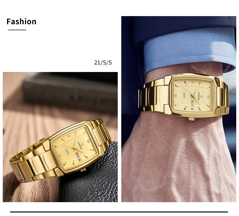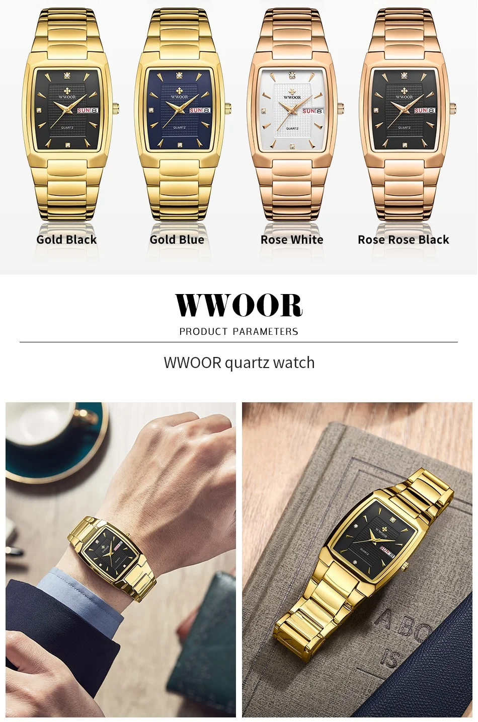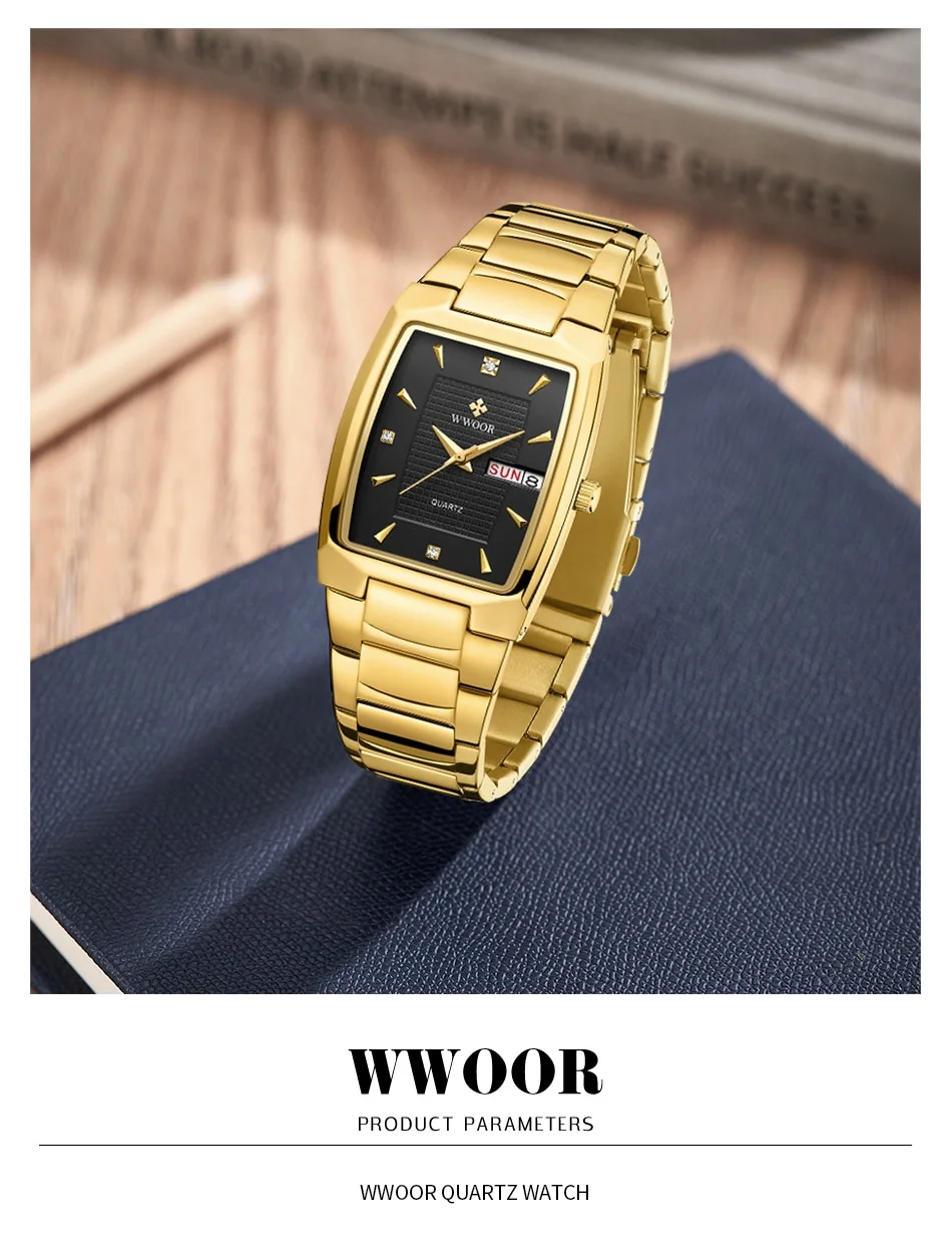 WWOOR 2024 Mens Square Watch Luxury Gold Stainless Steel Quartz Wristwatch