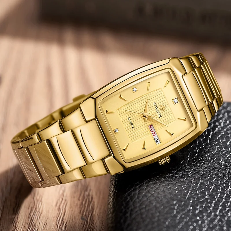The WWOOR 2024 Men’s Square Watch is ideal for those who value style, quality, and functionality. With its automatic week and date display, this watch is designed to keep you on track while adding a touch of elegance to your outfit. The gold stainless steel construction provides durability, while the quartz movement ensures accurate timekeeping. Designed for comfort and versatility, this watch is suitable for both everyday wear and special events, making it a valuable addition to any man’s accessory collection.