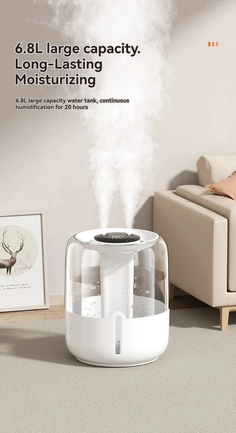 Enhance your indoor air quality with the Xiaomi 6.8L Large Capacity Humidifier, a sleek and modern device designed for home, office, and bedroom use. Featuring dual spray technology, a digital display, and a soothing night light, this humidifier combines functionality with elegance. Its USB compatibility ensures convenience, while the large capacity allows for long hours of uninterrupted operation.