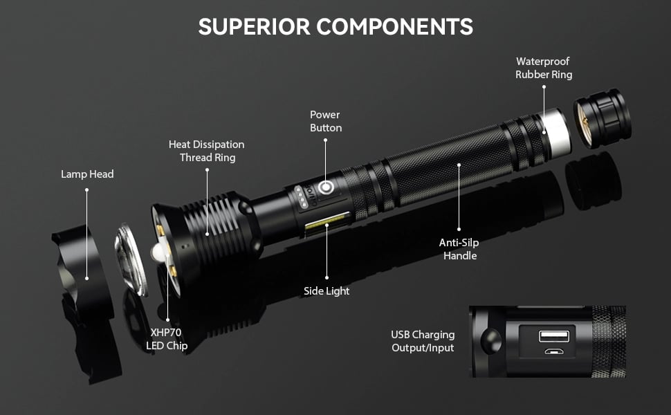 Flashlight power bank :USB input port allow you quickly charge the flash light and the USB output port help this led flashlight work as a power bank to charge your phone, camera and etc.