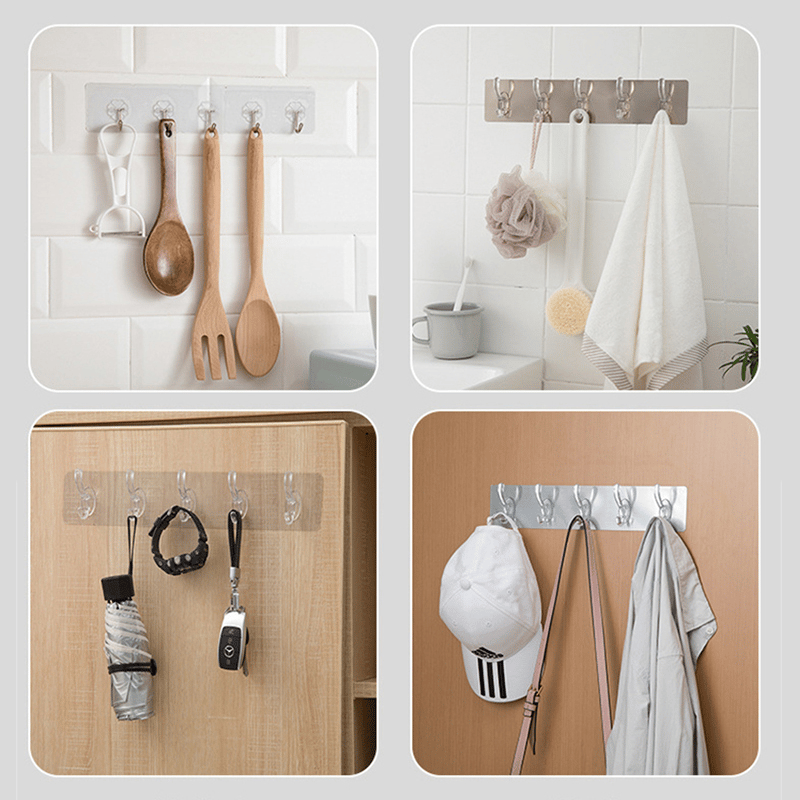 Adhesive Hooks: 1 set of 6 non-damaged hooks, no nails or drilling required. Waterproof, oil-proof, high and low