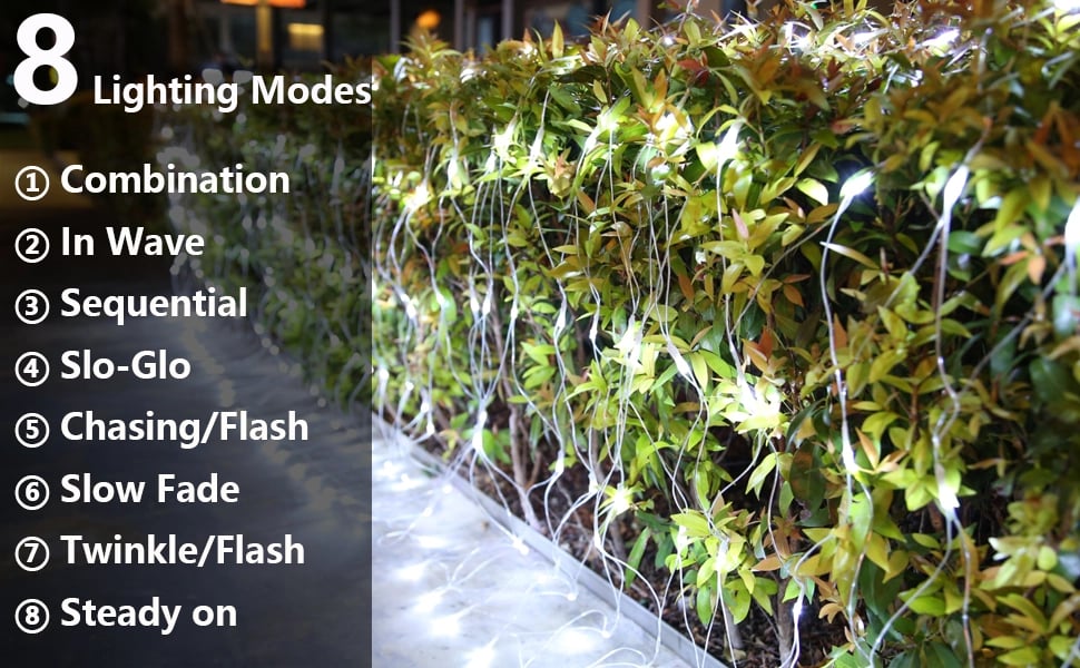 8 Modes with Memory Function: This mesh Christmas light has 8 different modes. Combination, Wave, Sequential, Slo-glo, Chase, Slow Decay, Blinking, and Steady. The net light's adaterpter is a built-in memory chip that saves your last mode setting, no need to reset the mode every day