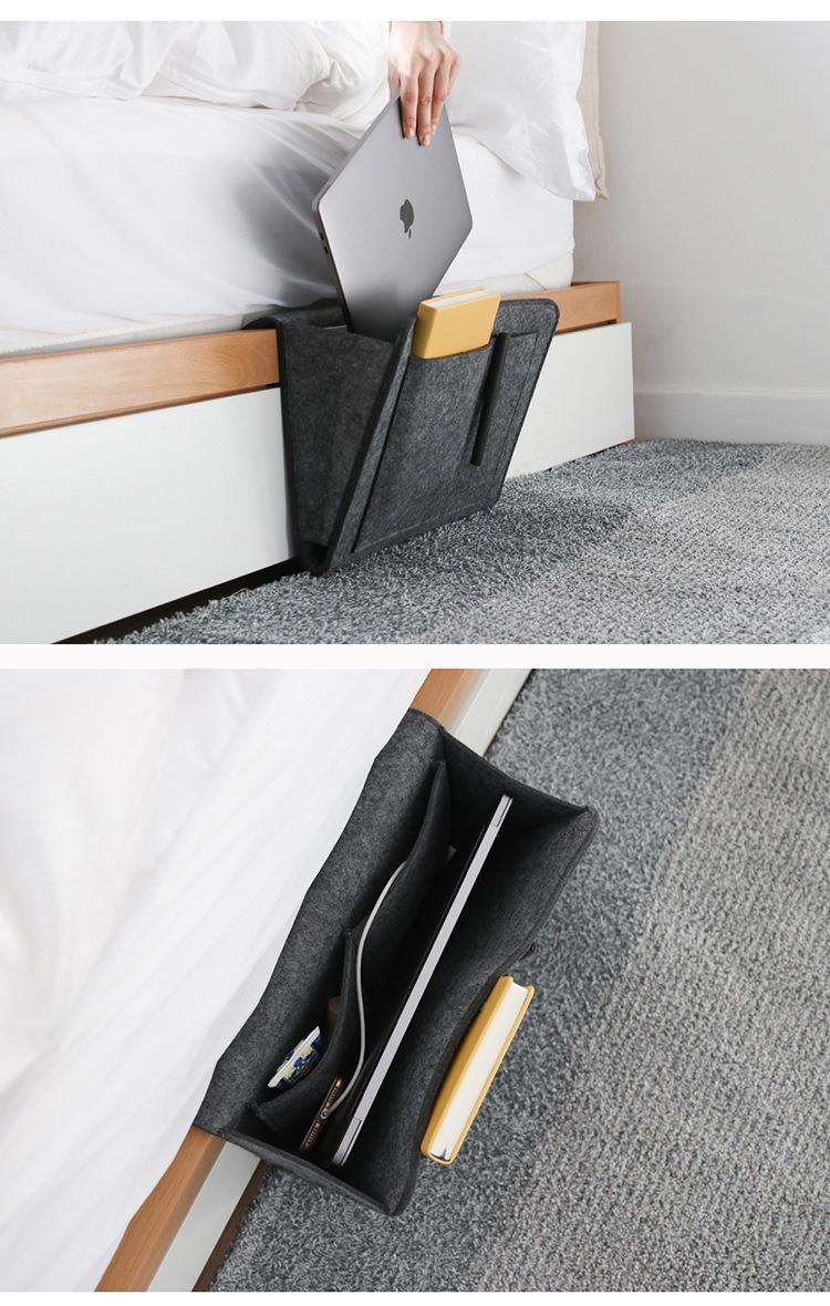 All Within Arms Reach. The bedside pocket can store all of your belongings together by your side while on bed,sofa or desk which have a safe and standard place, and no more lost things. More strong and durable, hold heavier things and will not be deformed